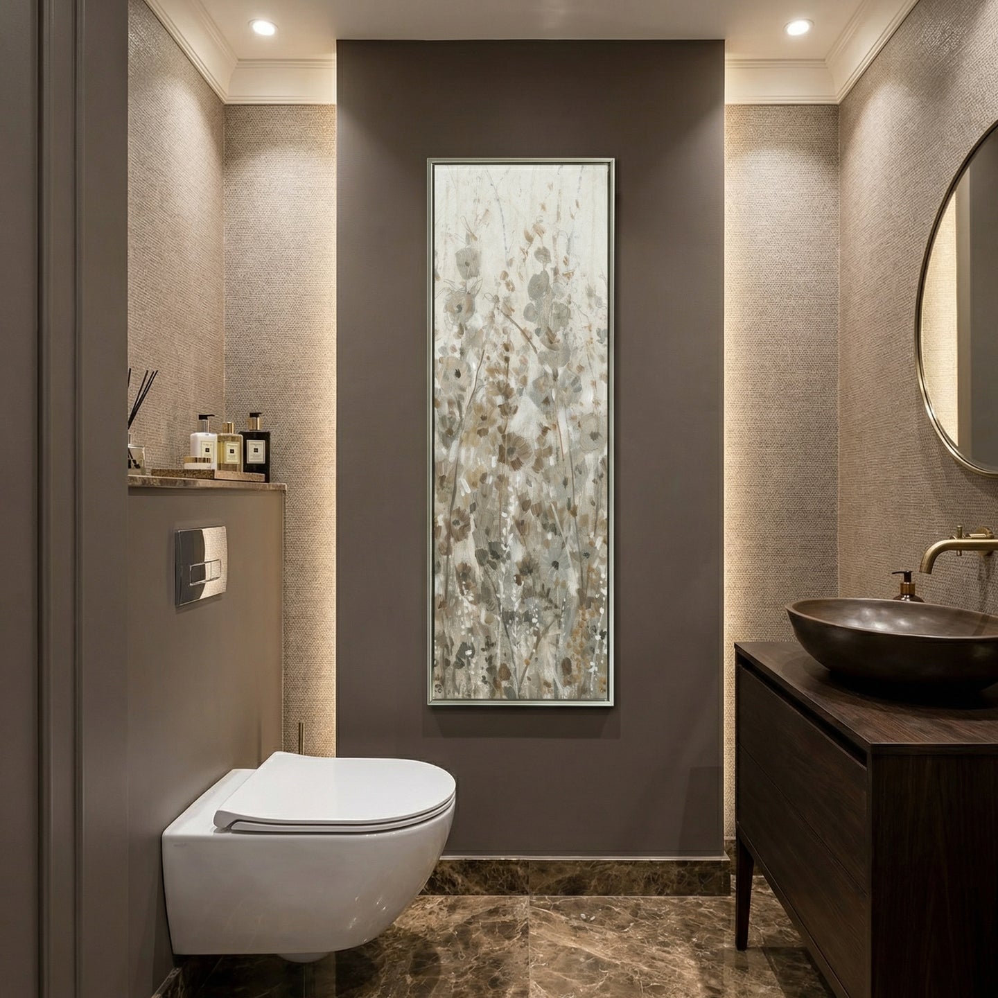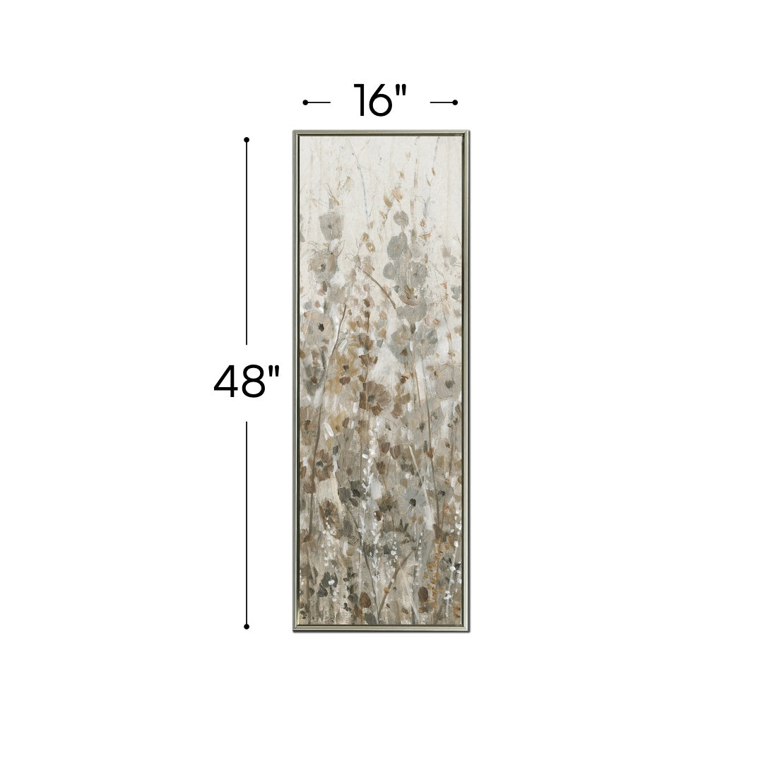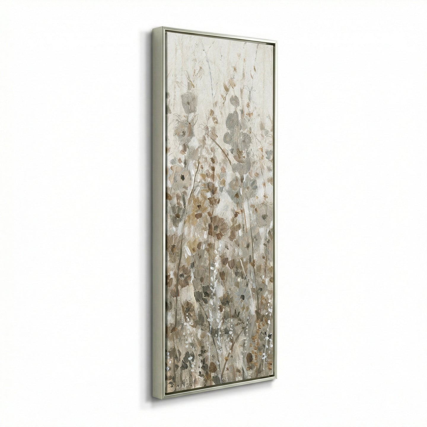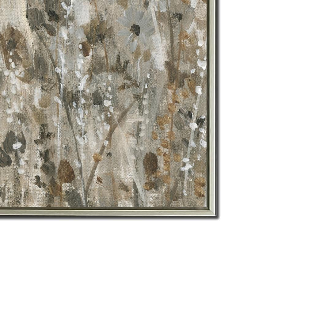 Hand embellished canvas art in a Champagne floating frame.