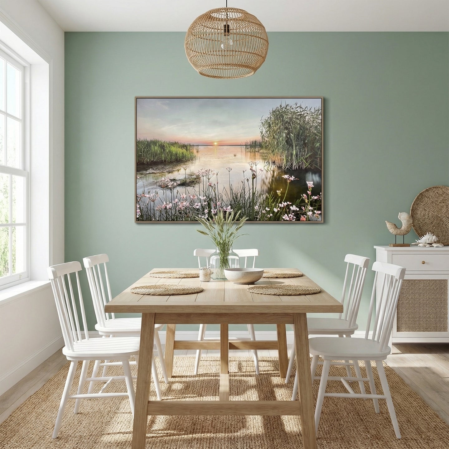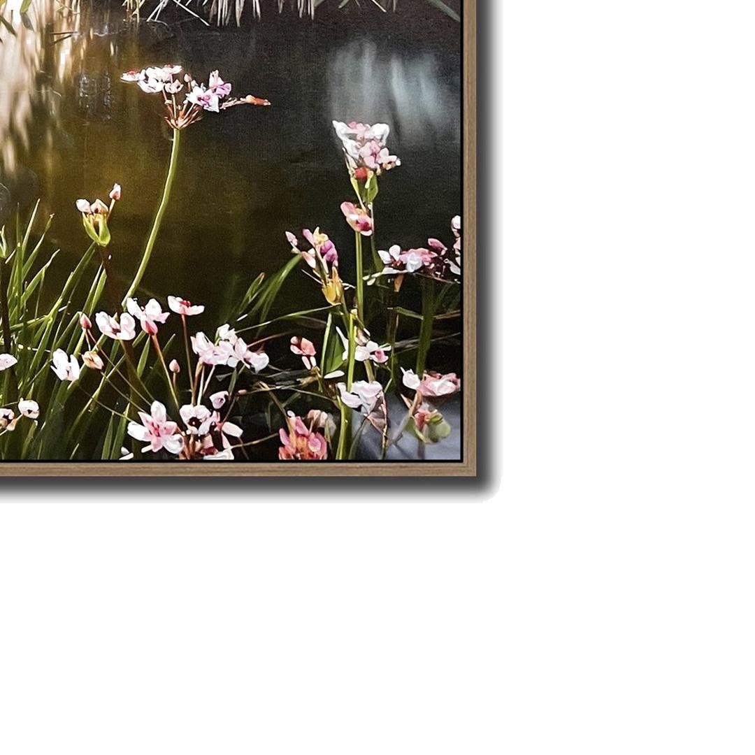 Hand embellished and lightly textured canvas art in an oak colored floating frame
