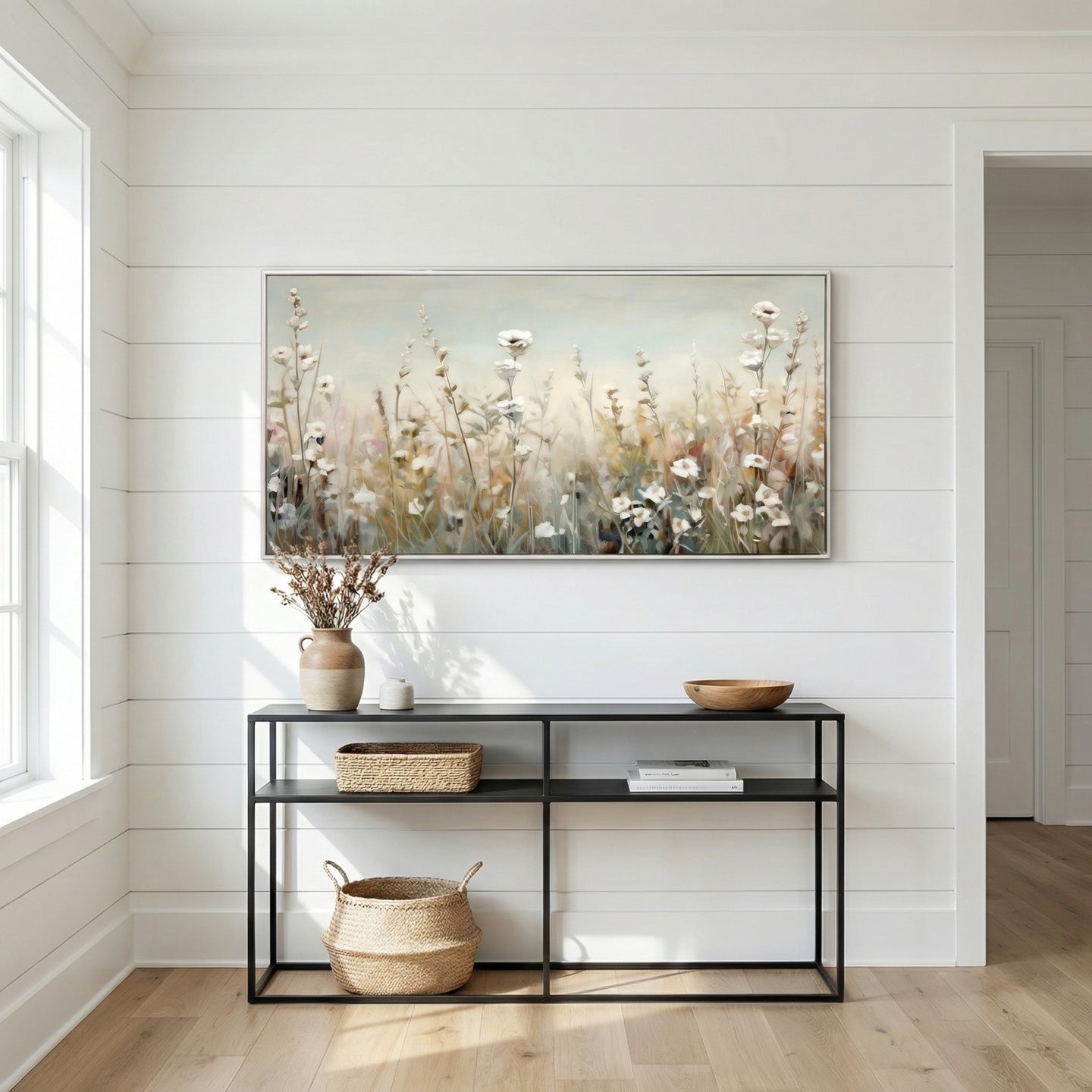 Hand embellished canvas art in a White floating frame