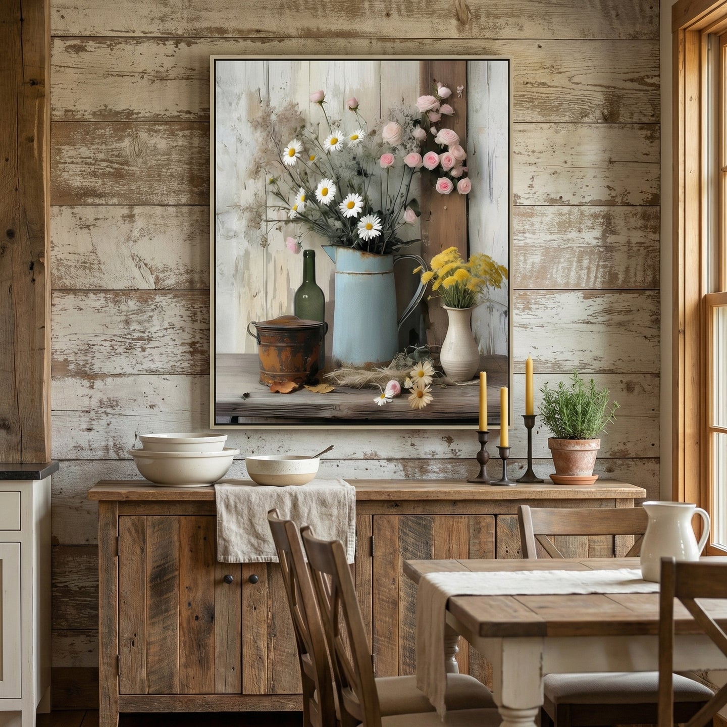 Hand embellished canvas art in a light, Natural Wood Colored Floating Frame